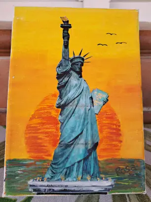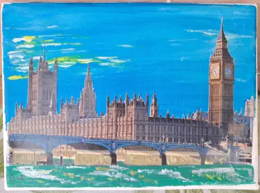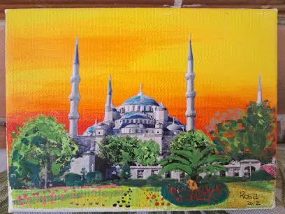 Decidí, entonces, aportar mi impronta a los cuadros y aposté por dotarlos de una variante a la acuarela, la acrílica. Así que combinando ambas y uniendo a ellas el collage, empecé a diseñar paisajes de aquí y de allá para regalárselos a mis amigas de diferentes partes del mundo. Primero seleccionaba un monumento o vista destacable del país de origen. A continuación, elegía el archivo en mi ordenador de la fotografía que cumpliera la nitidez suficiente para mi objetivo. Seguidamente, imprimía, en la mejor calidad posible, dicha foto y recortaba los elementos principales de la imagen. Después de preparar el lienzo con los colores que servirían de base, procedía a pegar el collage sobre dicho lienzo. Y, cuando ya parecía que aquello tomaba una belleza especial, le daba al cuadro el toque final. Así que, haciendo uso con una variedad de grosor de pinceles, le iba concediendo a la obra vida propia, ensalzando la hermosura del paisaje en inicio elegido.